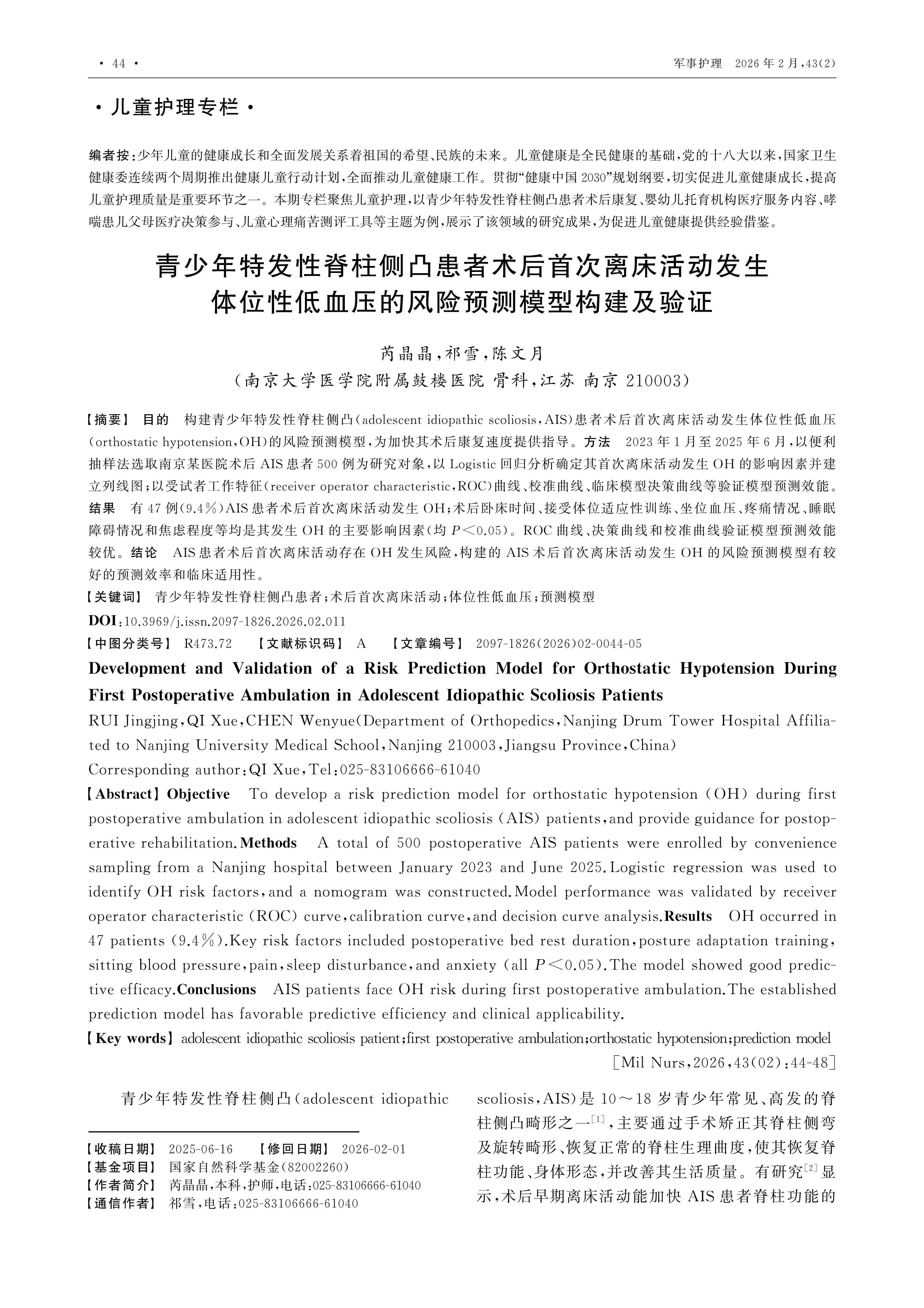 目的 构建青少年特发性脊柱侧凸(adolescent idiopathic scoliosis,AIS)患者术后首次离床活动发生体位性低血压(orthostatic hypotension,OH)的风险预测模型,为加快其术后康复速度提供指导。方法 2023年1月至2025年6月,以便利抽样法选取南京某医院术后AIS患者500例为研究对象,以Logistic回归分析确定其首次离床活动发生OH的影响因素并建立列线图;以受试者工作特征(receiver operator characteristic,ROC)曲线、校准曲线、临床模型决策曲线等验证模型预测效能。结果 有47例(9.4%)AIS患者术后首次离床活动发生OH;术后卧床时间、接受体位适应性训练、坐位血压、疼痛情况、睡眠障碍情况和焦虑程度等均是其发生OH的主要影响因素(均 P <0.05)。ROC曲线、决策曲线和校准曲线验证模型预测效能较优。结论 AIS患者术后首次离床活动存在OH发生风险,构建的AIS术后首次离床活动发生OH的风险预测模型有较好的预测效率和临床适用性。