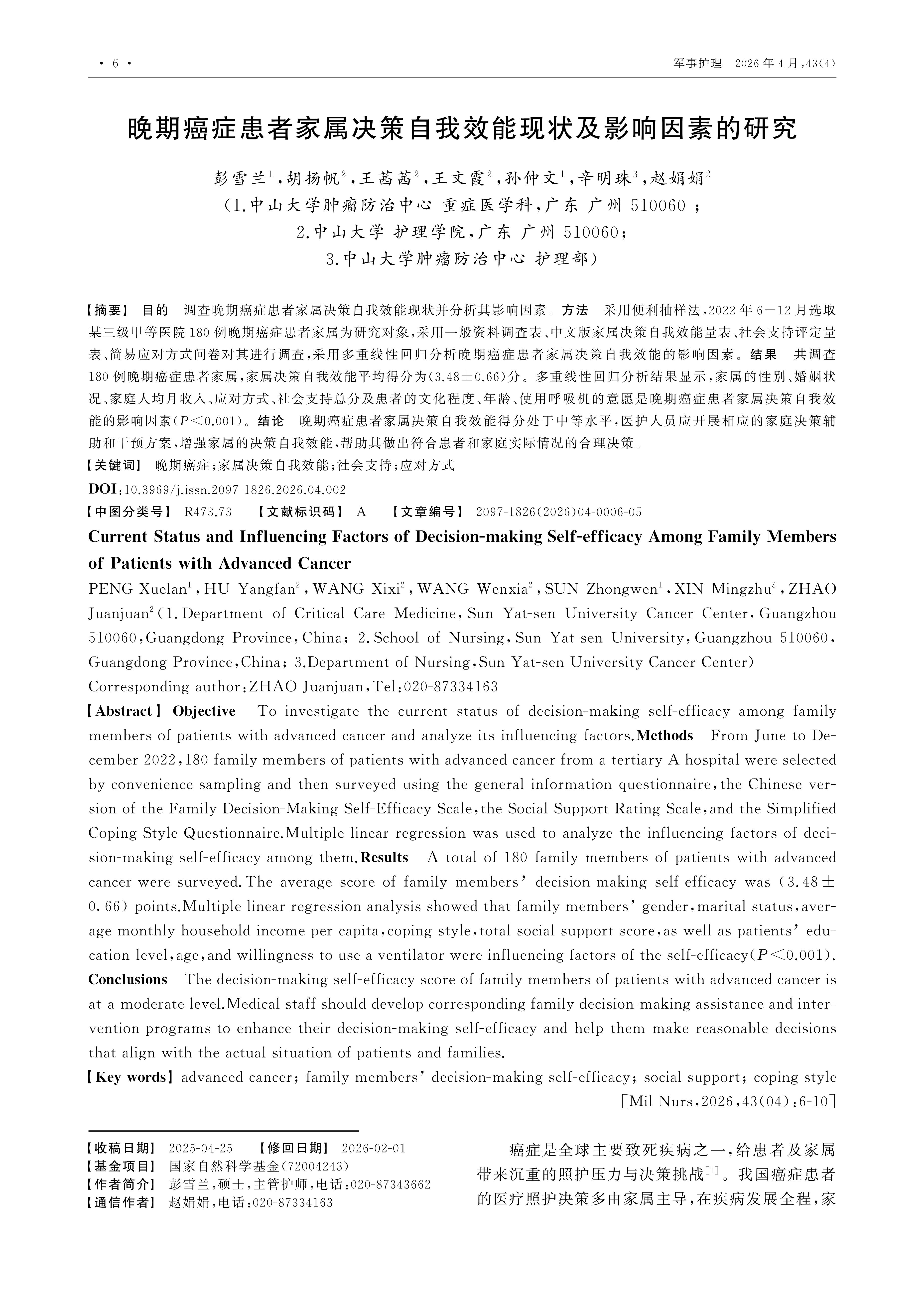 目的 调查晚期癌症患者家属决策自我效能现状并分析其影响因素。方法 采用便利抽样法,2022年6-12月选取某三级甲等医院180例晚期癌症患者家属为研究对象,采用一般资料调查表、中文版家属决策自我效能量表、社会支持评定量表、简易应对方式问卷对其进行调查,采用多重线性回归分析晚期癌症患者家属决策自我效能的影响因素。结果 共调查180例晚期癌症患者家属,家属决策自我效能平均得分为(3.48±0.66)分。多重线性回归分析结果显示,家属的性别、婚姻状况、家庭人均月收入、应对方式、社会支持总分及患者的文化程度、年龄、使用呼吸机的意愿是晚期癌症患者家属决策自我效能的影响因素(P<0.001)。结论 晚期癌症患者家属决策自我效能得分处于中等水平,医护人员应开展相应的家庭决策辅助和干预方案,增强家属的决策自我效能,帮助其做出符合患者和家庭实际情况的合理决策。