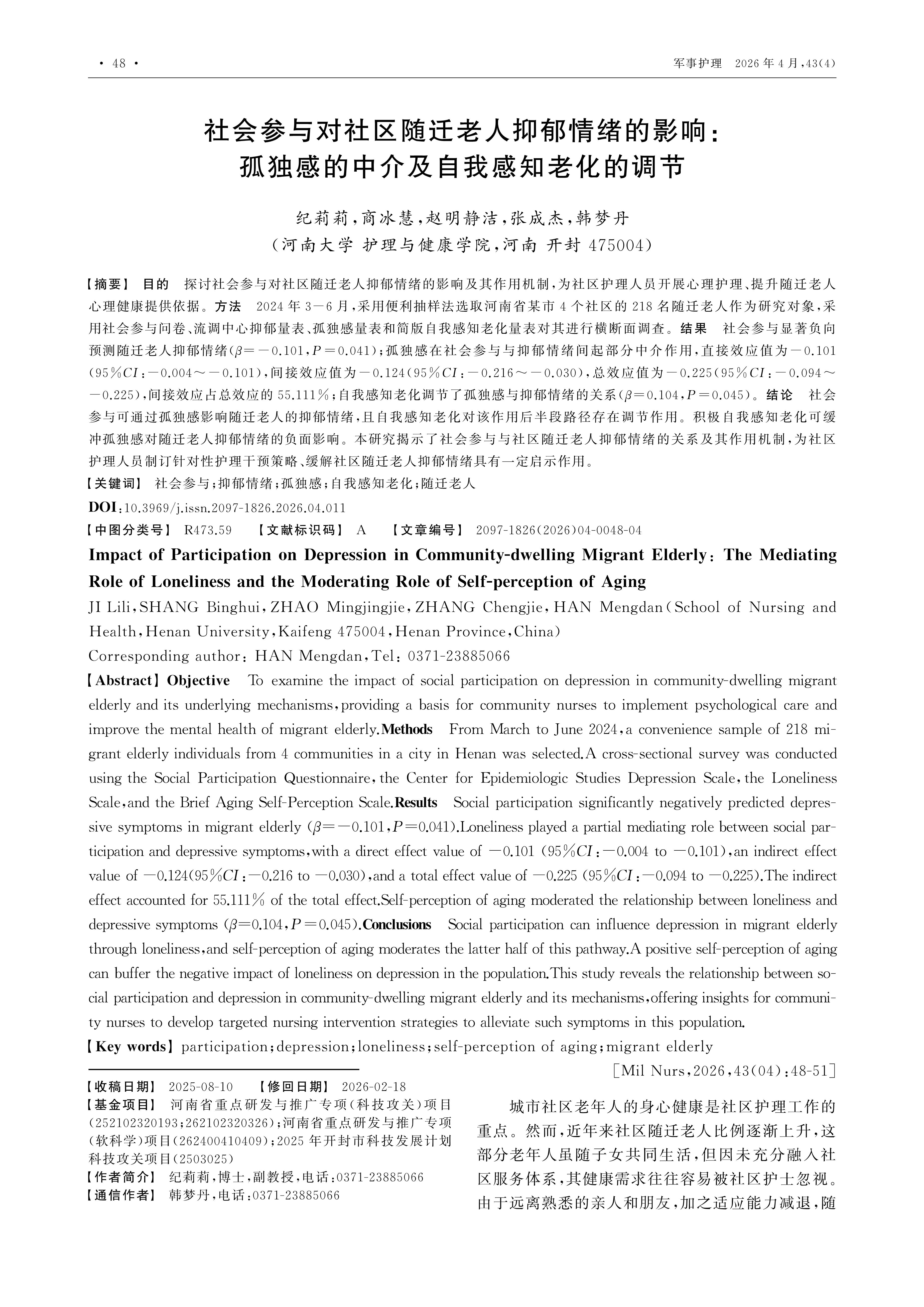 社会参与对社区随迁老人抑郁情绪的影响:孤独感的中介及自我感知老化的调节