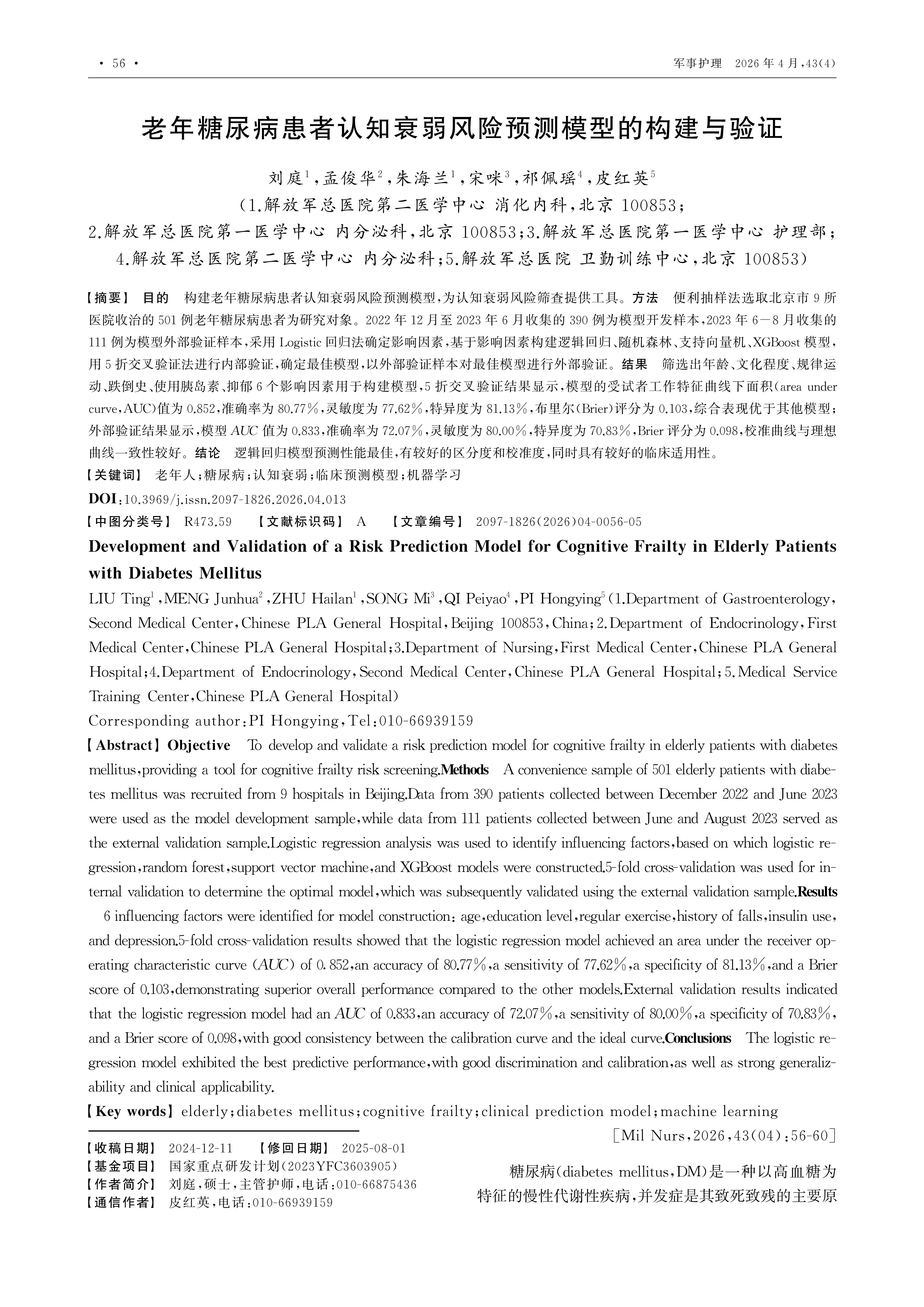 目的 构建老年糖尿病患者认知衰弱风险预测模型,为认知衰弱风险筛查提供工具。方法 便利抽样法选取北京市9所医院收治的501例老年糖尿病患者为研究对象。2022年12月至2023年6月收集的390例为模型开发样本,2023年6-8月收集的111例为模型外部验证样本,采用Logistic回归法确定影响因素,基于影响因素构建逻辑回归、随机森林、支持向量机、XGBoost模型,用5折交叉验证法进行内部验证,确定最佳模型,以外部验证样本对最佳模型进行外部验证。结果 筛选出年龄、文化程度、规律运动、跌倒史、使用胰岛素、抑郁6个影响因素用于构建模型,5折交叉验证结果显示,模型的受试者工作特征曲线下面积(area under curve,AUC)值为0.852,准确率为80.77%,灵敏度为77.62%,特异度为81.13%,布里尔(Brier)评分为0.103,综合表现优于其他模型;外部验证结果显示,模型AUC值为0.833,准确率为72.07%,灵敏度为80.00%,特异度为70.83%,Brier评分为0.098,校准曲线与理想曲线一致性较好。结论 逻辑回归模型预测性能最佳,有较好的区分度和校准度,同时具有较好的临床适用性。