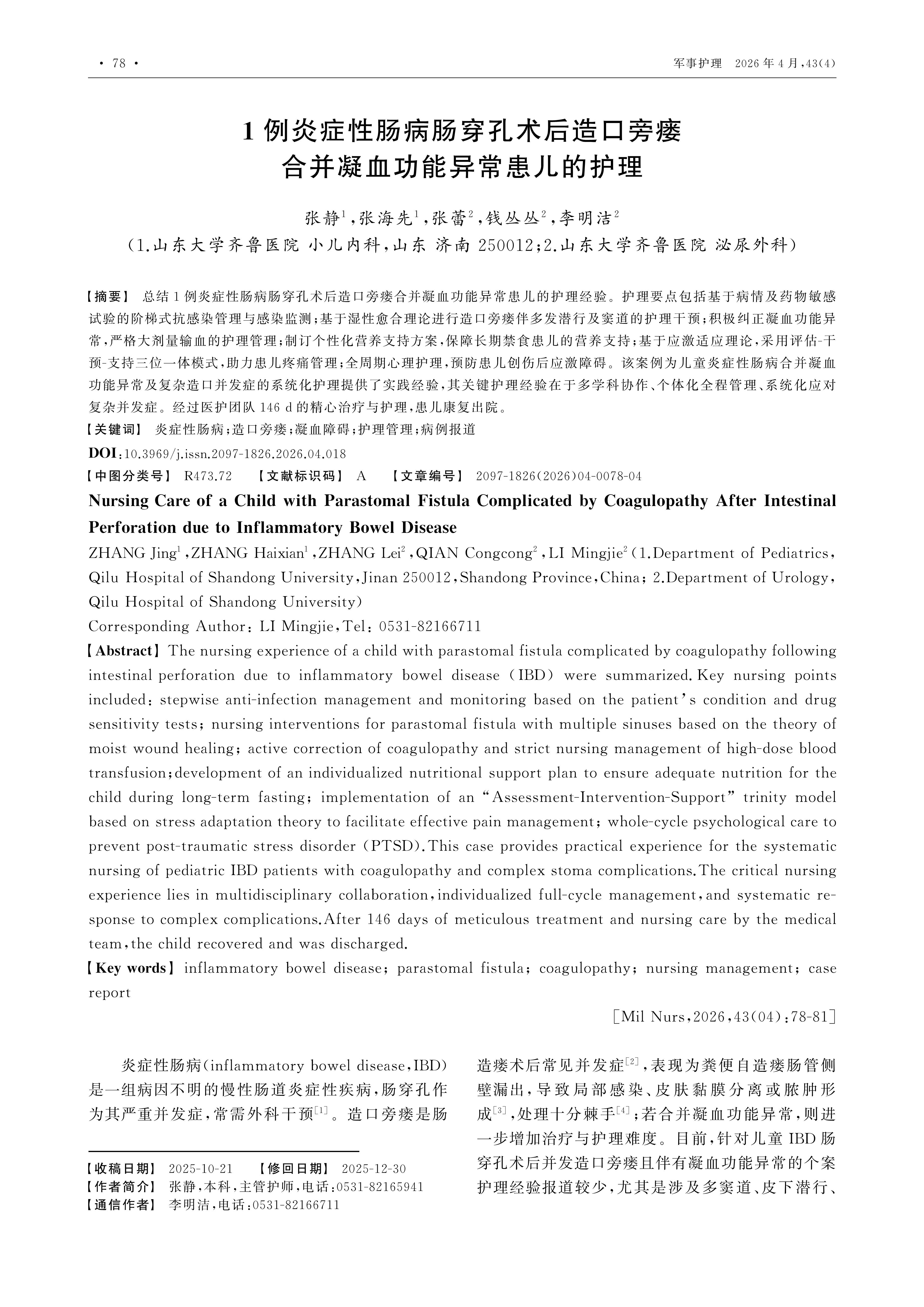 The nursing experience of a child with parastomal fistula complicated by coagulopathy following intestinal perforation due to inflammatory bowel disease (IBD) were summarized.Key nursing points included: stepwise anti-infection management and monitoring based on the patient’s condition and drug sensitivity tests; nursing interventions for parastomal fistula with multiple sinuses based on the theory of moist wound healing; active correction of coagulopathy and strict nursing management of high-dose blood transfusion;development of an individualized nutritional support plan to ensure adequate nutrition for the child during long-term fasting; implementation of an “Assessment-Intervention-Support” trinity model based on stress adaptation theory to facilitate effective pain management; whole-cycle psychological care to prevent post-traumatic stress disorder (PTSD).This case provides practical experience for the systematic nursing of pediatric IBD patients with coagulopathy and complex stoma complications.The critical nursing experience lies in multidisciplinary collaboration,individualized full-cycle management,and systematic response to complex complications.After 146 days of meticulous treatment and nursing care by the medical team,the child recovered and was discharged.