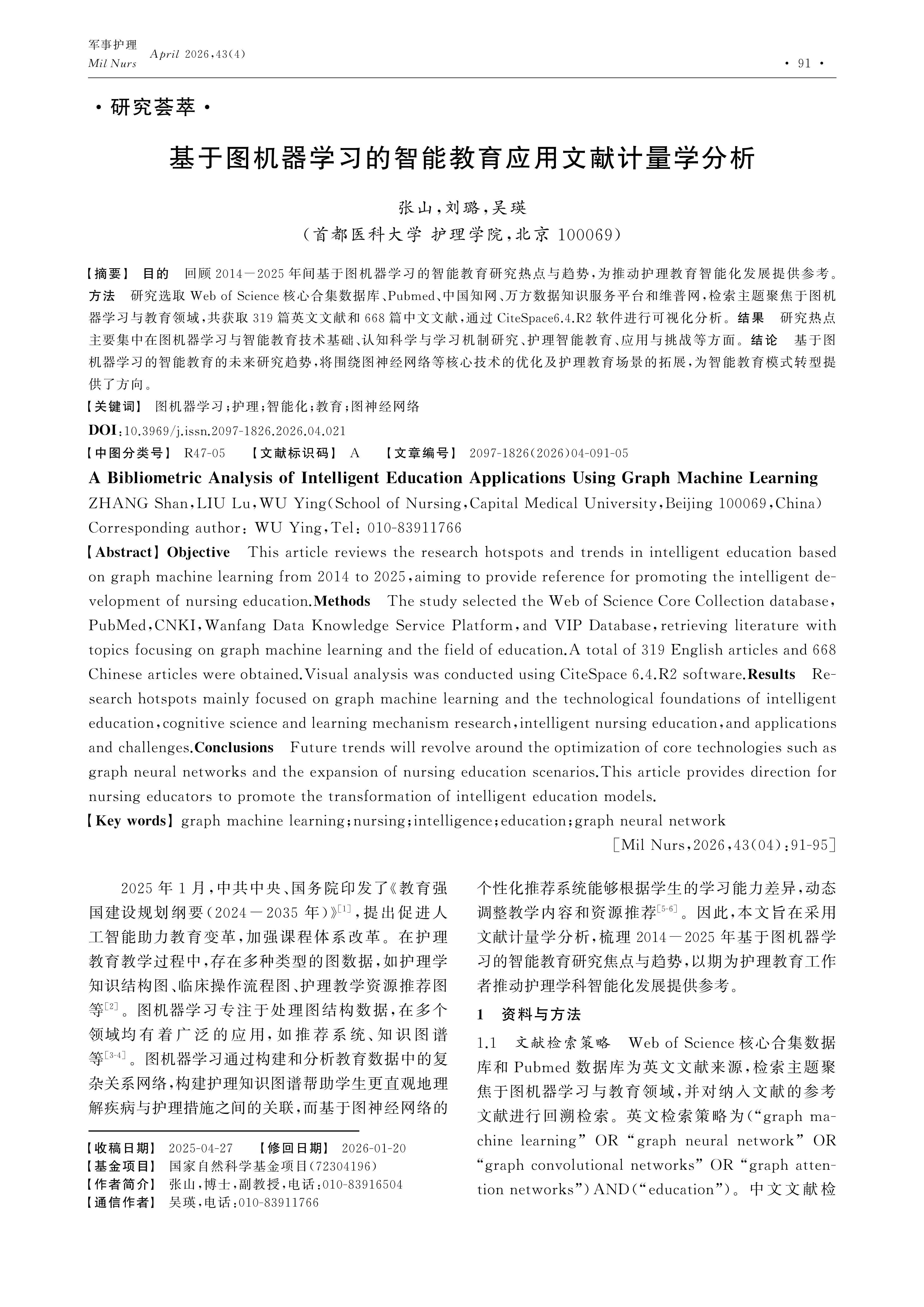 Objective This article reviews the research hotspots and trends in intelligent education based on graph machine learning from 2014 to 2025,aiming to provide reference for promoting the intelligent development of nursing education.Methods The study selected the Web of Science Core Collection database,PubMed,CNKI,Wanfang Data Knowledge Service Platform,and VIP Database,retrieving literature with topics focusing on graph machine learning and the field of education.A total of 319 English articles and 668 Chinese articles were obtained.Visual analysis was conducted using CiteSpace 6.4.R2 software.Results Research hotspots mainly focused on graph machine learning and the technological foundations of intelligent education,cognitive science and learning mechanism research,intelligent nursing education,and applications and challenges.Conclusions Future trends will revolve around the optimization of core technologies such as graph neural networks and the expansion of nursing education scenarios.This article provides direction for nursing educators to promote the transformation of intelligent education models.